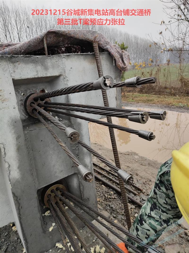 谷城县新集电站移民安置交通桥高台铺交通桥长127米,宽7.5米,净宽6.5米,桥面高程78.04,6跨,间距20米,桩基础,持力层中风化泥灰岩,T梁为预应力构件。